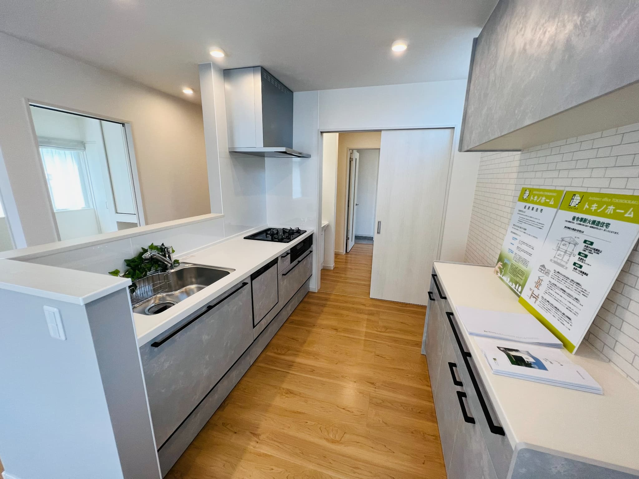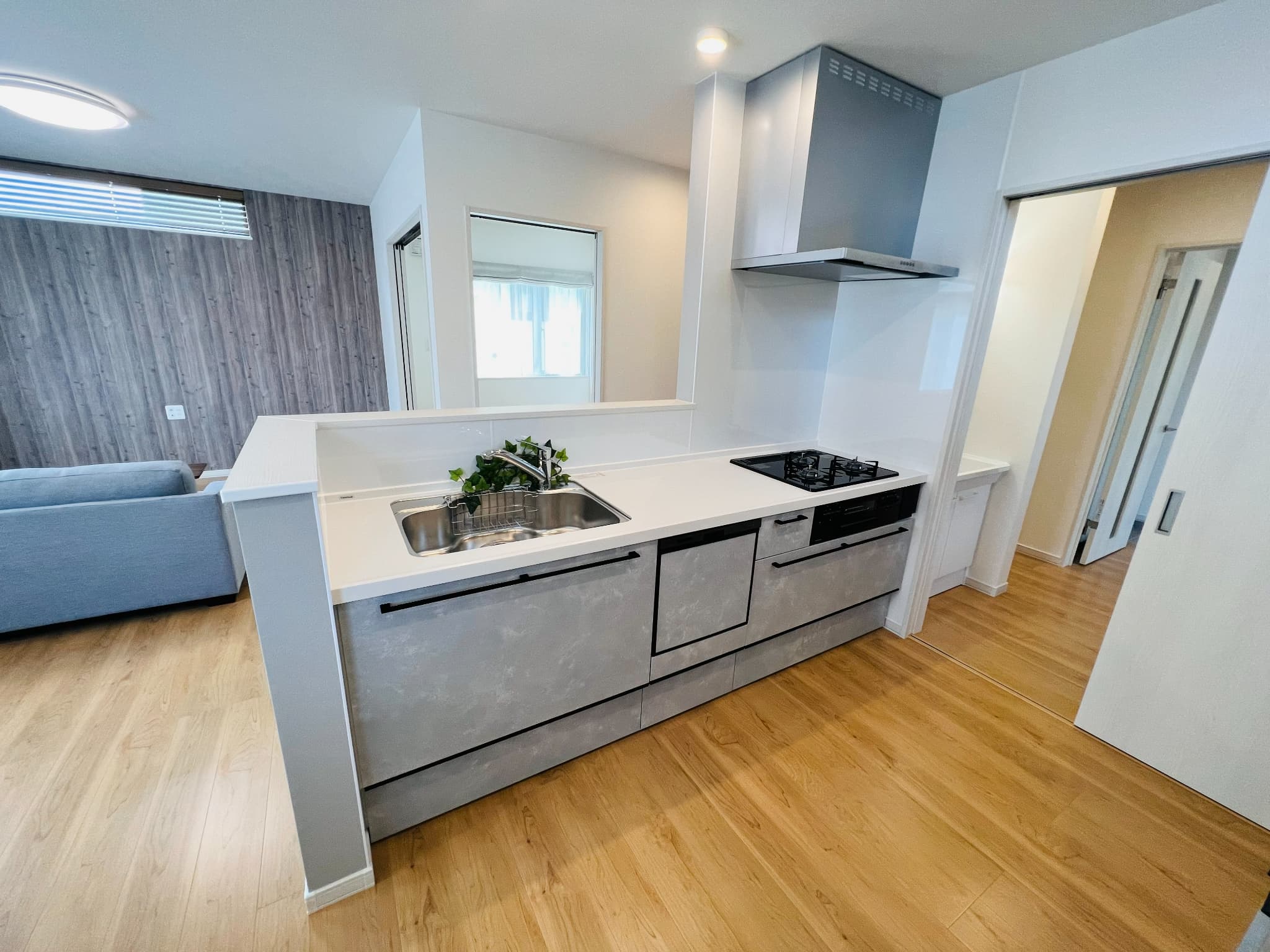 ホワイトの天板とグレーのキャビネットを組み合わせたモダンなキッチン。効率的な動線と収納力で、毎日の暮らしをスマートにサポートします。