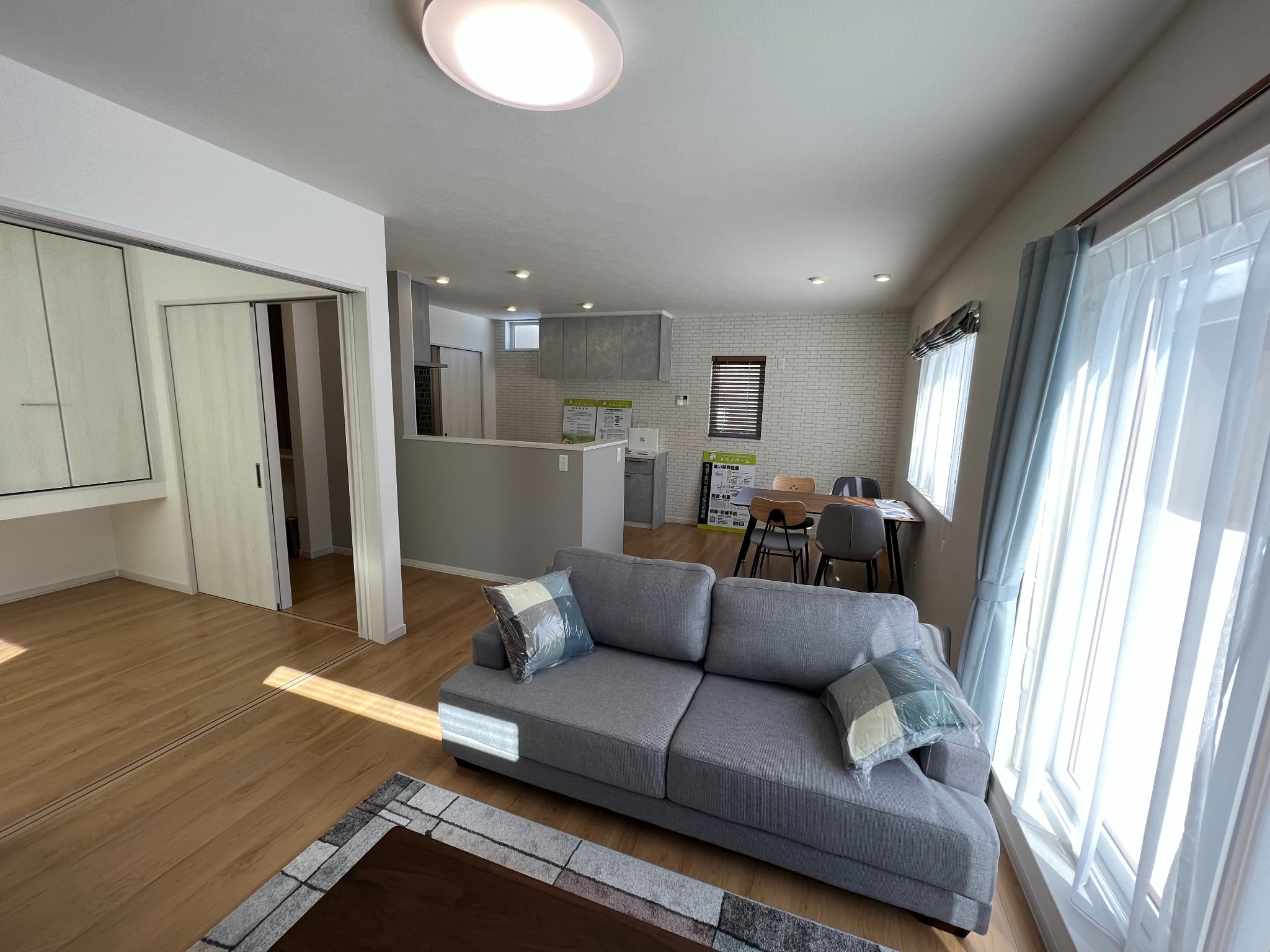 大きな窓から自然光が差し込み、リビング・ダイニング・キッチン全体が明るく心地よい空間に。家族が自然と集まり、快適に過ごせる設計です。