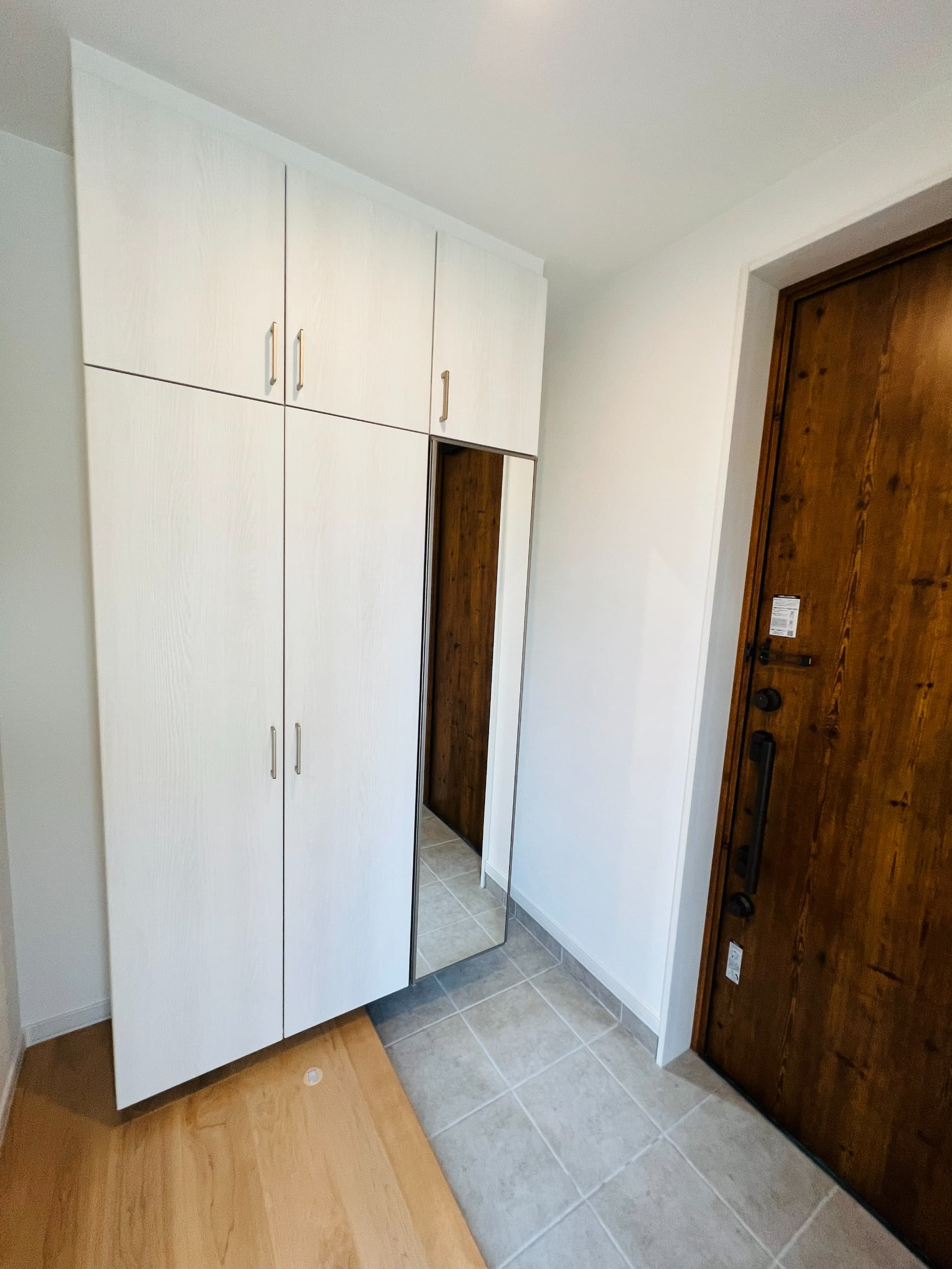 玄関奥には除雪用具をはじめ、ベビーカーやアウトドア用品などをすっきりと収められる収納スペースを確保。冬場の出入りがスムーズになるだけでなく、暮らしの中で増えがちな一時置きにも活躍します。見た目の美しさと使いやすさを両立した、機能的な玄関設計です。