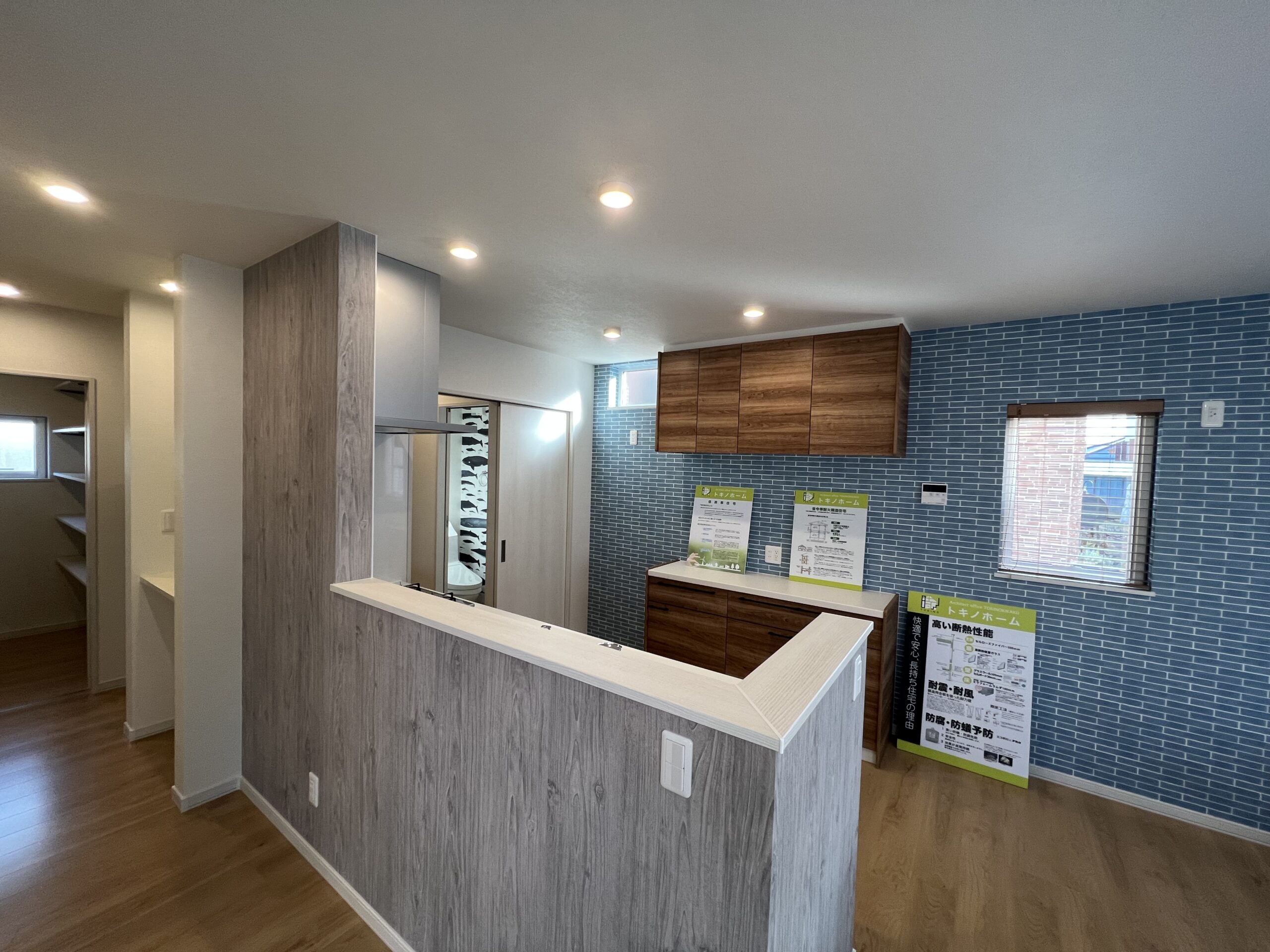 3. 機能性とデザイン性を両立したキッチン ホワイトの天板と木目キャビネットを組み合わせたキッチンは、清潔感と温もりを兼ね備えたデザイン。ブルー系のタイルをあしらったバックパネルが空間に彩りを添え、毎日の料理が楽しくなる仕様です。