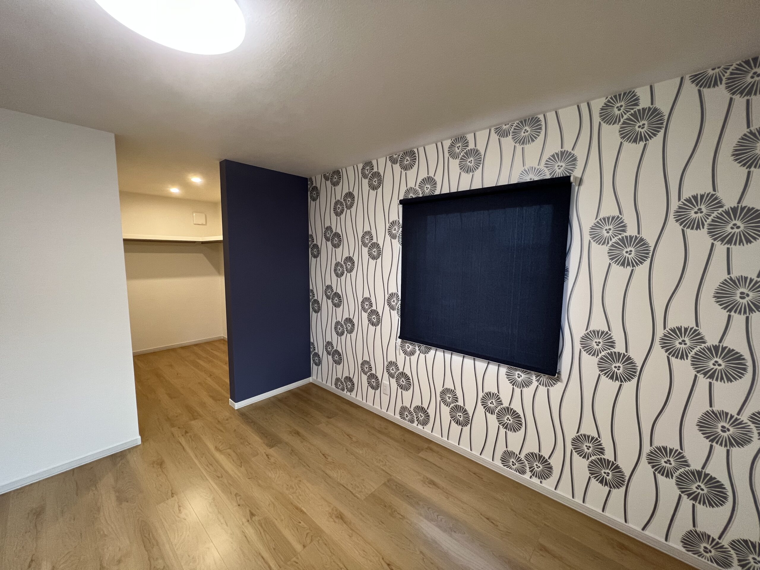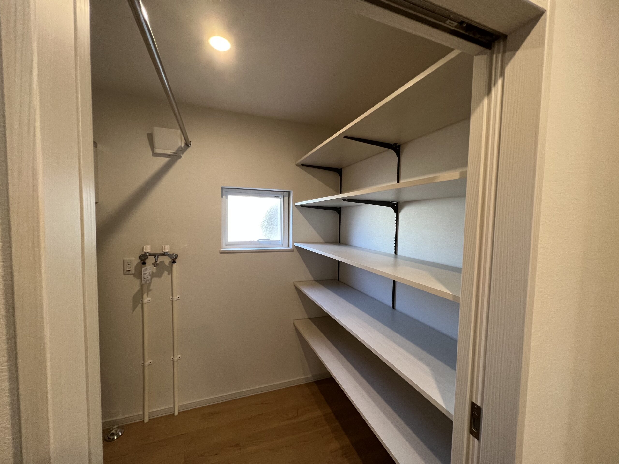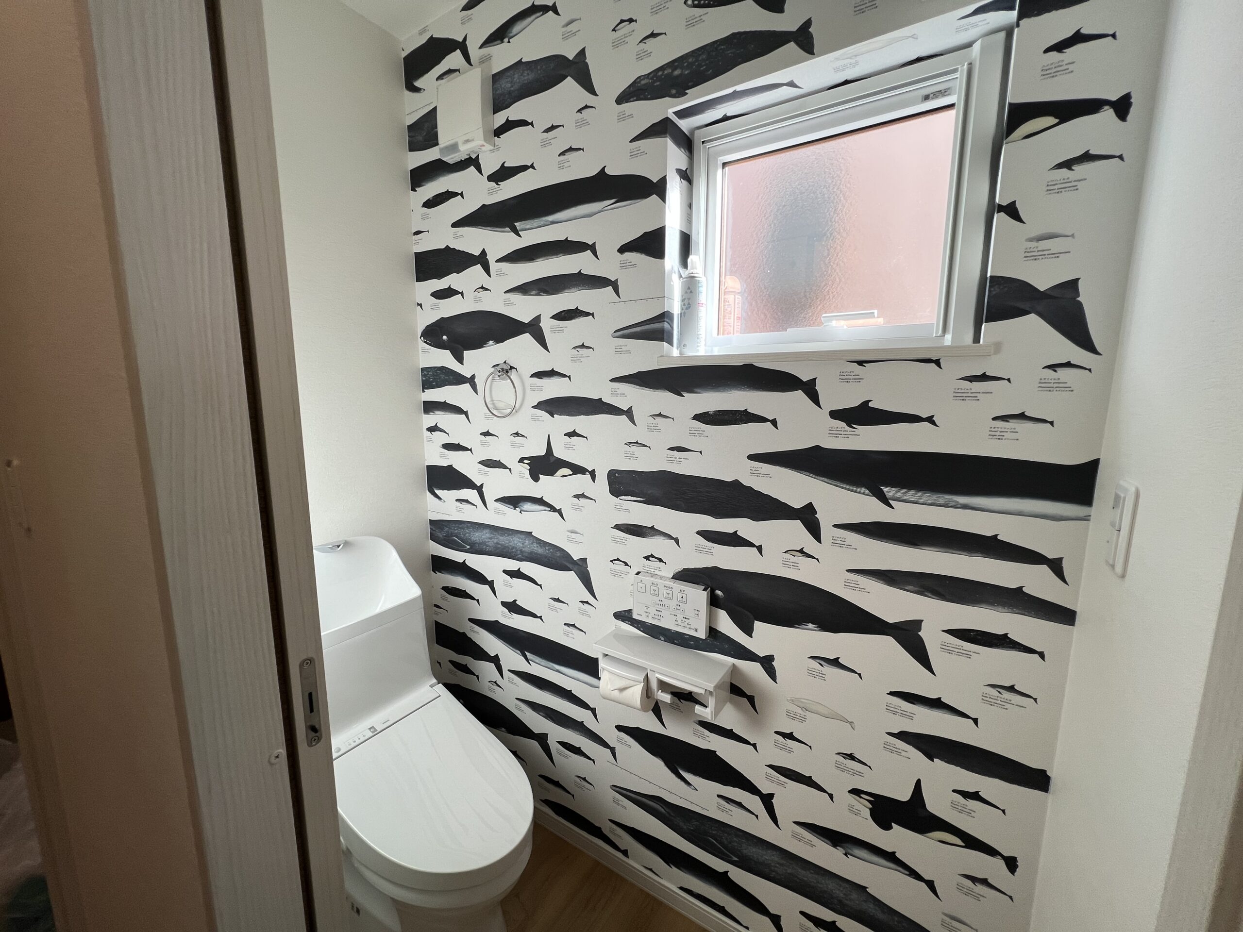 4. 暮らしを支える収納と水回りの工夫 洗面室には可動棚やハンガーパイプを設け、洗濯・収納・乾燥までを効率よくこなせる設計。トイレには遊び心あるマリン柄のクロスを採用し、機能性だけでなく空間の楽しさも演出しています。