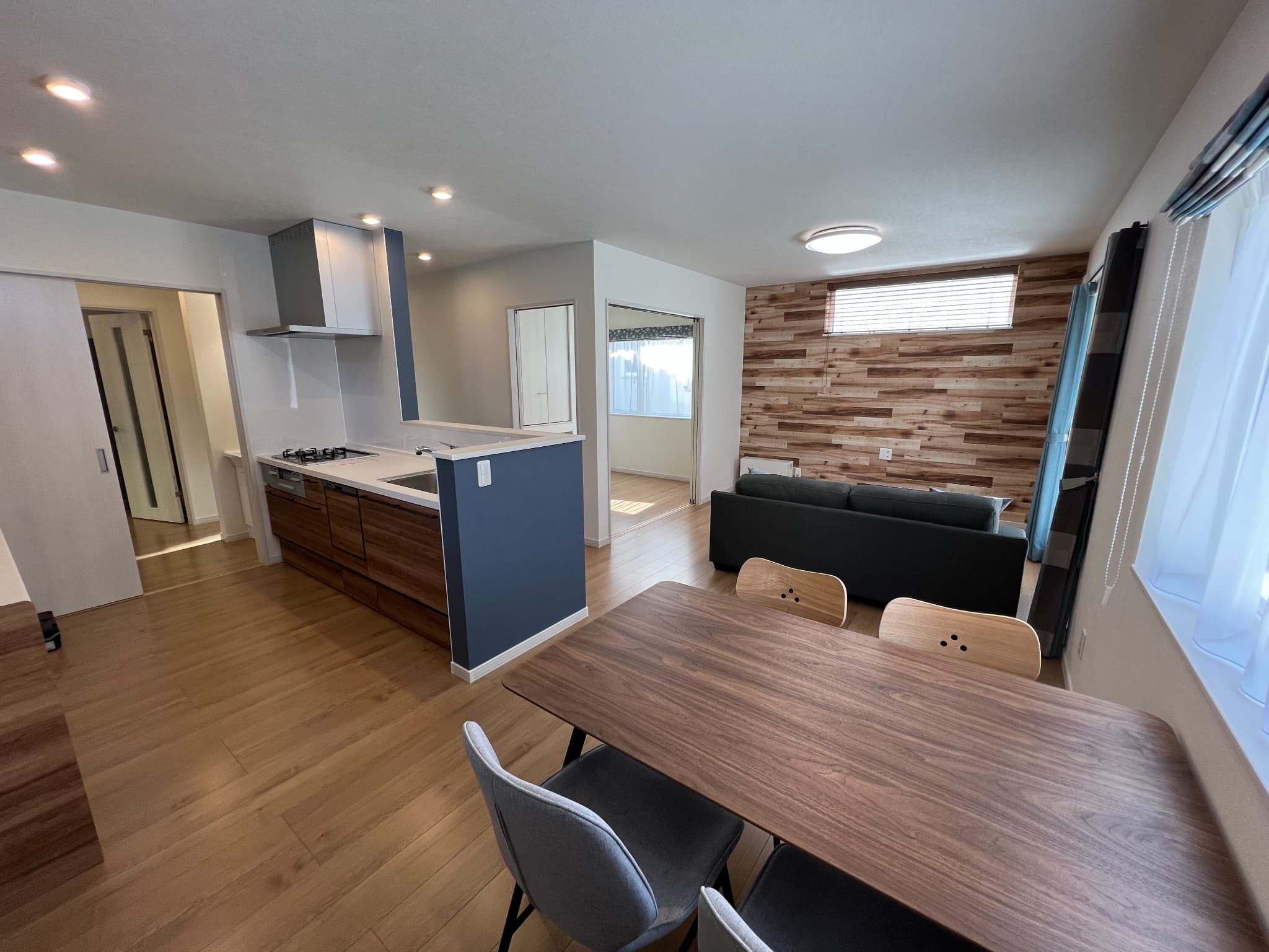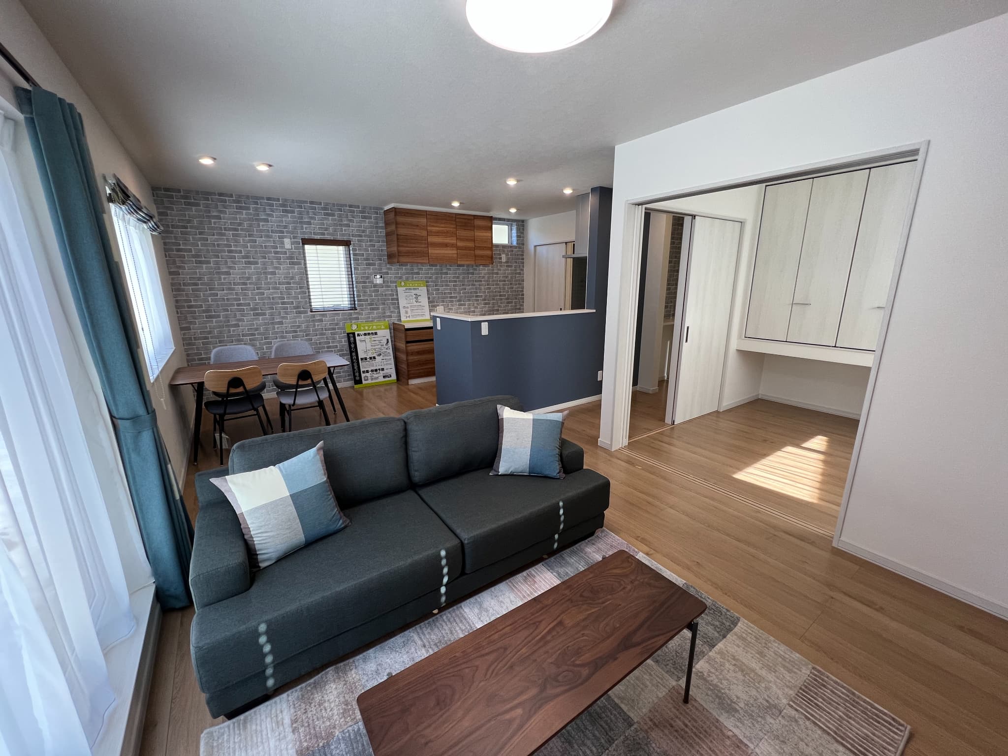 木目フローリングと白壁を基調とした室内は、明るくナチュラルな雰囲気に包まれています。ダイニング・リビング・キッチンが一体となった設計により、家族が自然と集まり、会話や食事を楽しみながら心地よく過ごせる空間を実現しました。