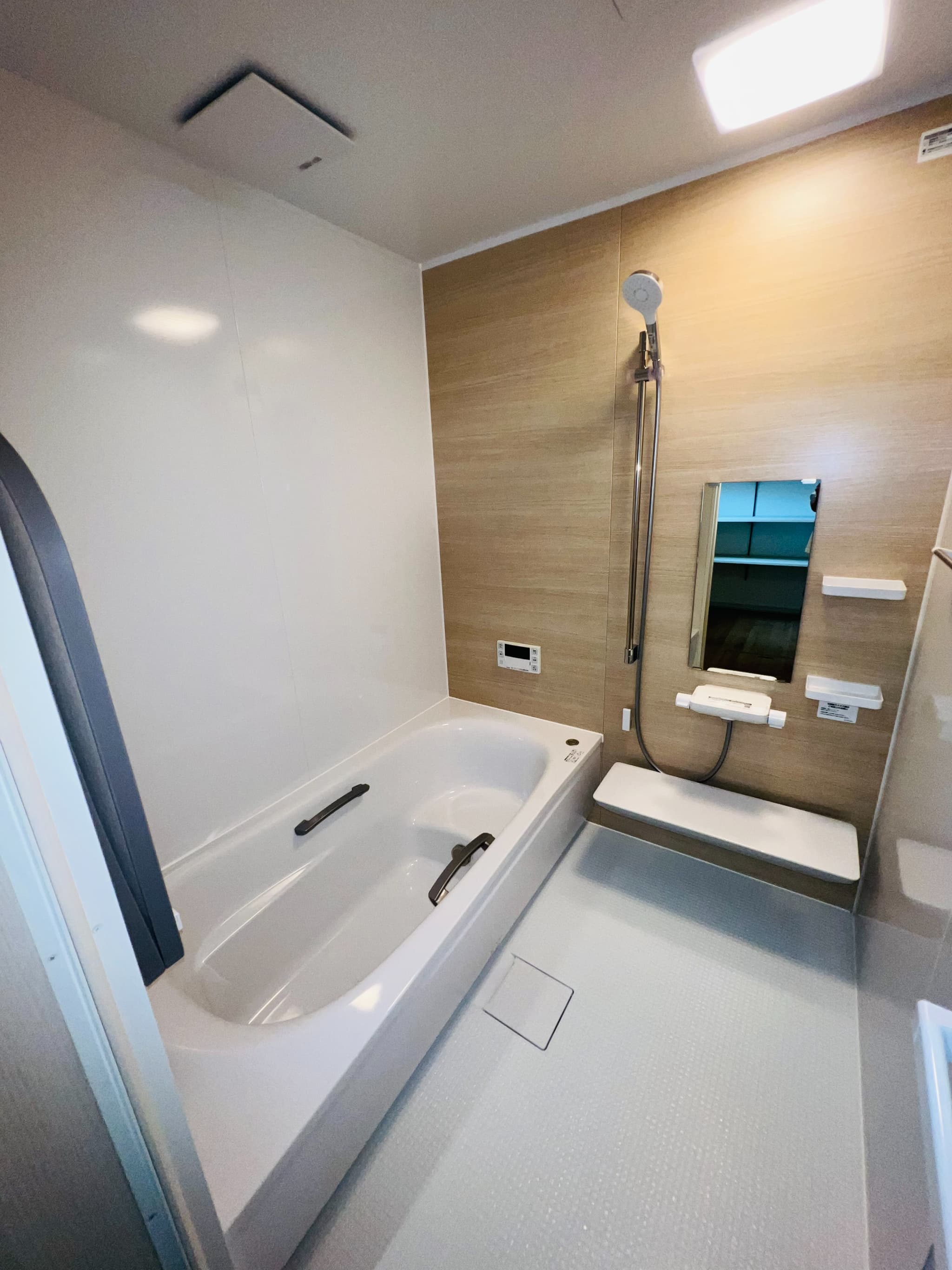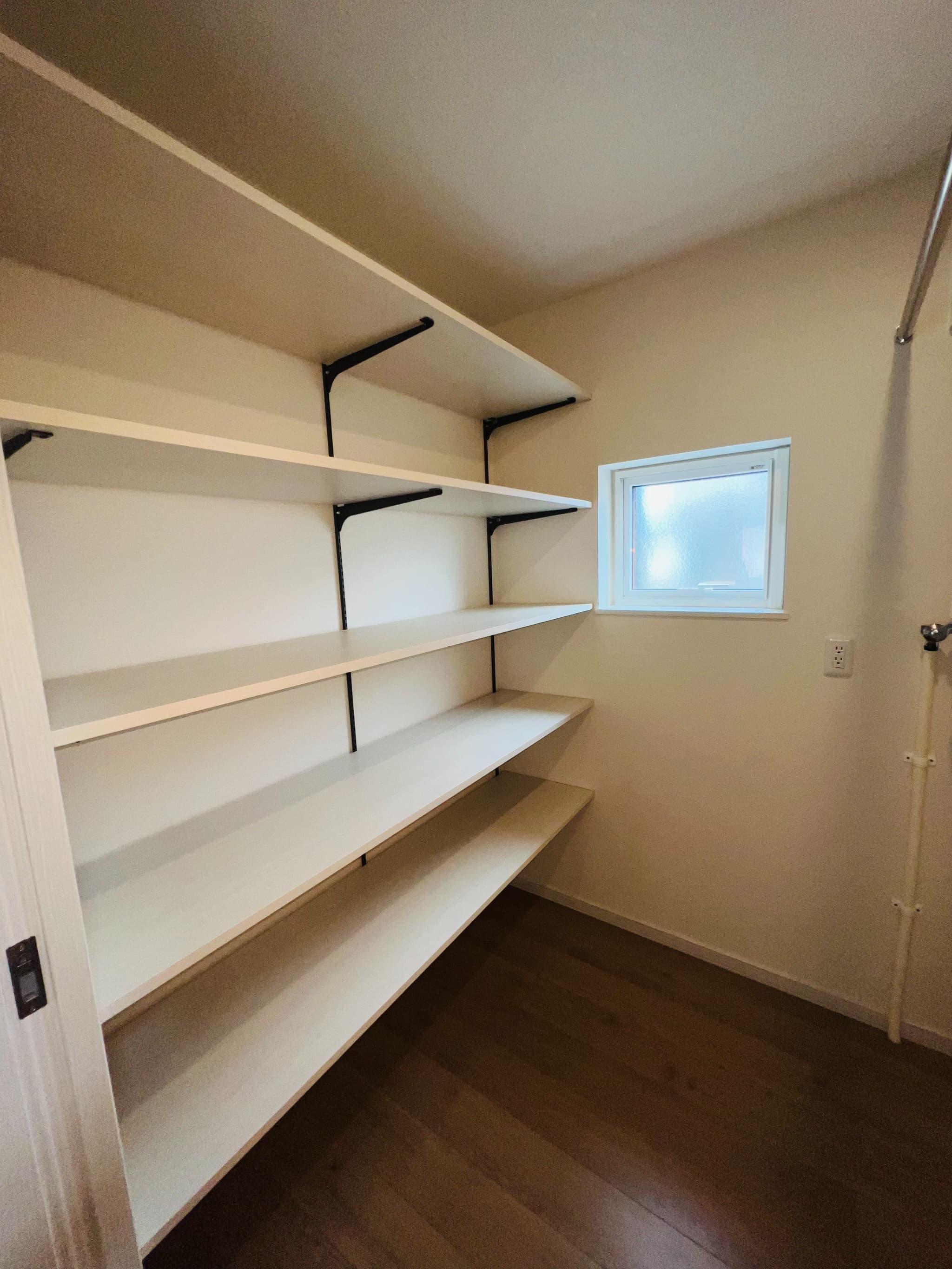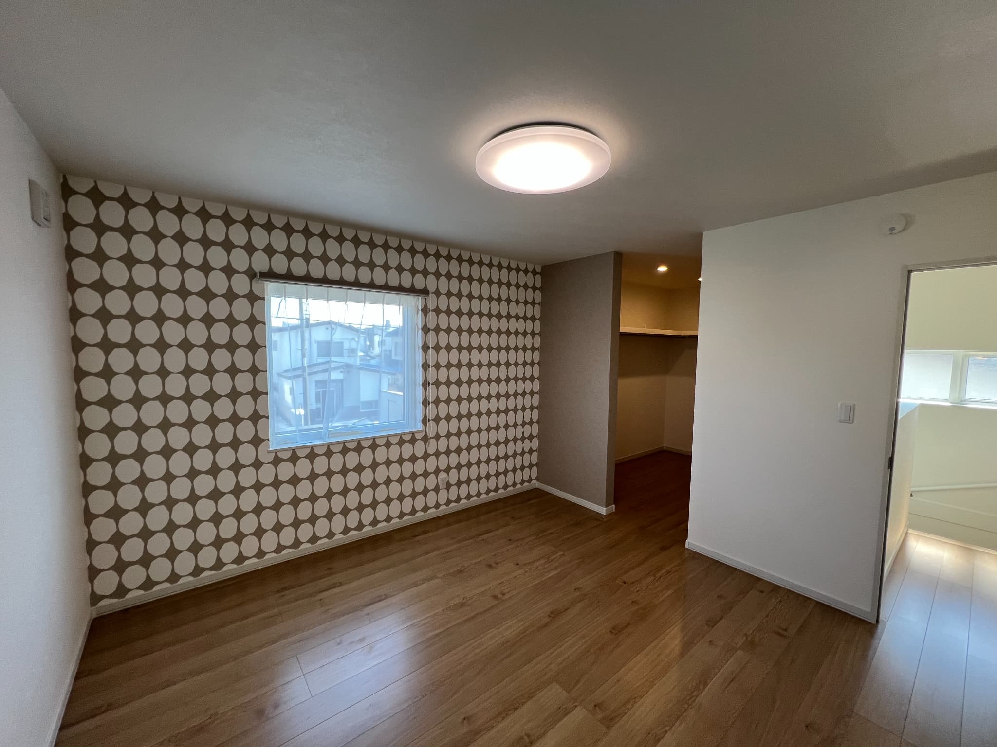 アクセントクロスが空間に個性を与える洋室には、大容量のウォークイン収納を設置しました。衣類や生活用品をすっきりと収められるため、居室を広々と使えるのが魅力です。デザイン性のあるクロスと機能的な収納が調和し、見た目の楽しさと日常の快適さを両立。