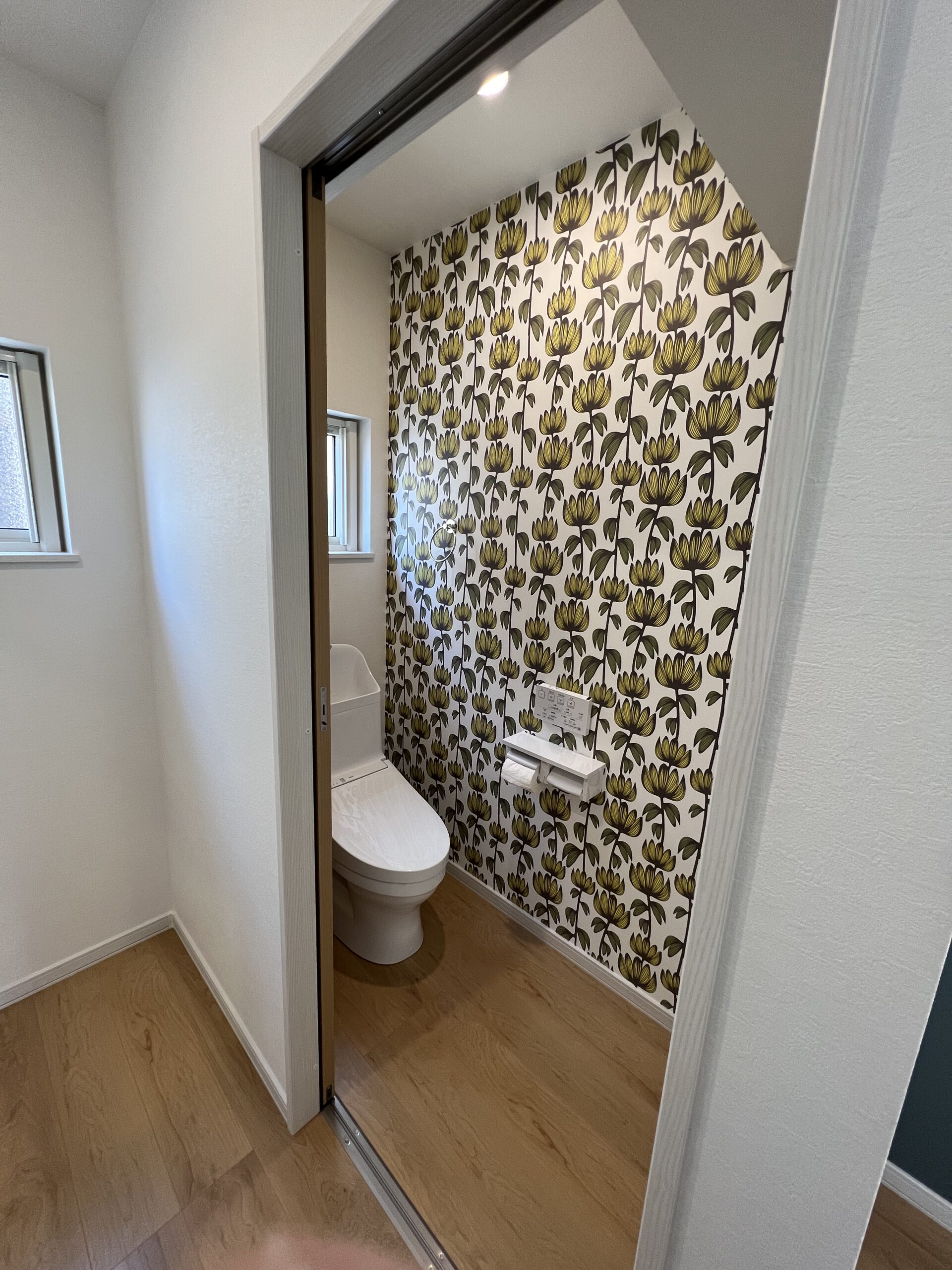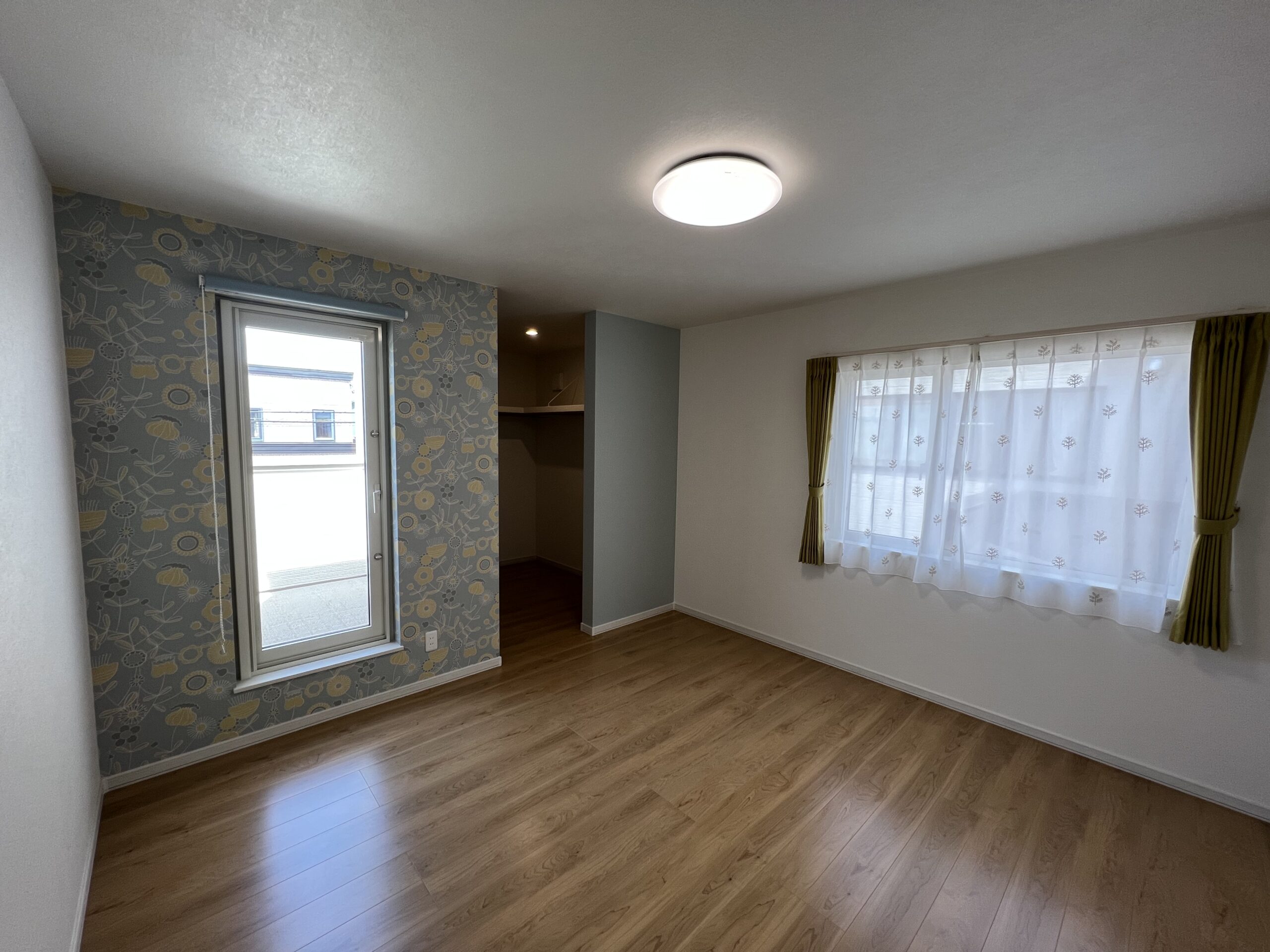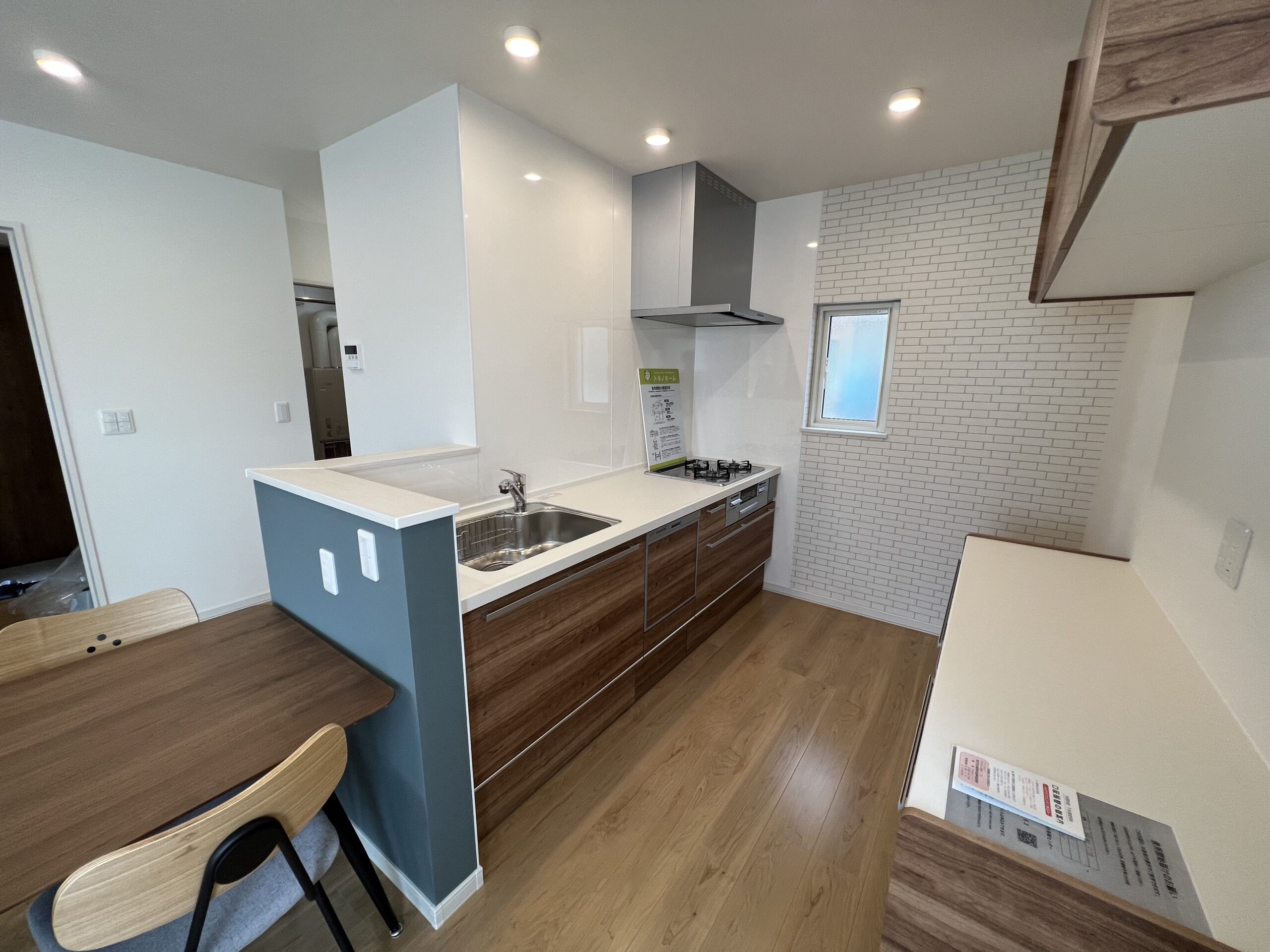 室内は木目フローリングと白壁を基調に、アクセントとしてヘリンボーン柄のクロスを採用。シンプルながらもデザイン性の高い空間で、家族が心地よく過ごせます。